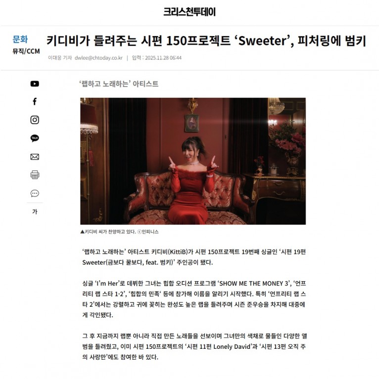 [기사] 키디비가 들려주는 시편 150프로젝트 ‘Sweeter’, 피처링에 범키(크리스천투데이)
